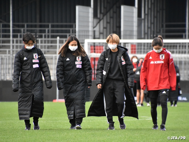 練習後は池田太監督が公式会見に臨みました。新体制で初となる海外チームとの対戦に「率直に本当に楽しみ」と語り、10月のトレーニングキャンプから継続して取り組んでいる「奪う」というコンセプトを意識した中で、2022年1月に開催されるAFC女子アジアカップインド2022に向けあらゆる面で大会を想定した戦いをしたいと話しました。また同じく練習後にオンライン取材に応じた熊谷紗希選手も「まだまだエラーが出てくるかもしれないですが、狙いを持ったチャレンジをしていきたい」と、積極的なプレーを通して課題の発見を求め、チームとしてのさらなる成長機会として今回の国際親善試合を捉えていました。