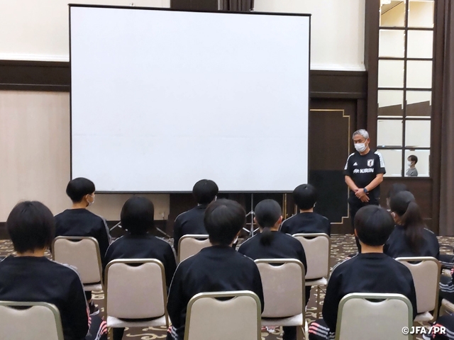 この日の夜には、2011年FIFA女子ワールドカップの大会映像を見ながら、佐々木則夫女子委員長が当時の体験談を語りました。「将来なでしこジャパンになること」「ワールドカップで優勝し、世界一を獲ること」を目標としている選手たちは、佐々木委員長の話を真剣な表情で聞きました。