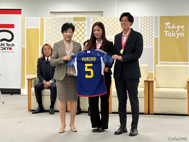 日ごろ、東京都内のチームでプレーする井上ねね選手と須藤優里亜選手らが、今年9月に国際大会(NSDF Women’s Futsal Championship 2023)で優勝し、来年開催予定の第6回アジアインドア&マーシャルアーツゲームズに出場することを小池都知事へ報告しました。また、フットサル日本女子代表の特製ユニフォームを贈呈し、さらなる活躍を誓うと、小池都知事からも温かい激励のお言葉を頂きました。