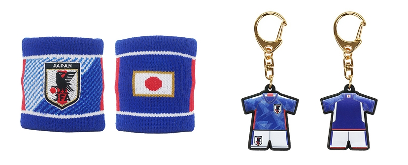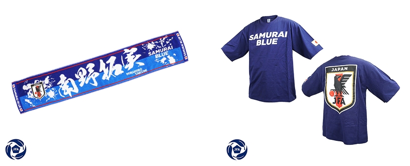 サッカー日本代表「SAMURAI BLUE」選手の名前や背番号が入ったプレーヤーズグッズ、試合観戦時でも普段でも使えるアパレル、「なでしこジャパン」も含めたサッカー日本代表の応援に欠かせないタオルマフラー、その他にも日常生活で活躍するバッグ・キーホルダー等を特別価格でお買い上げいただけます。