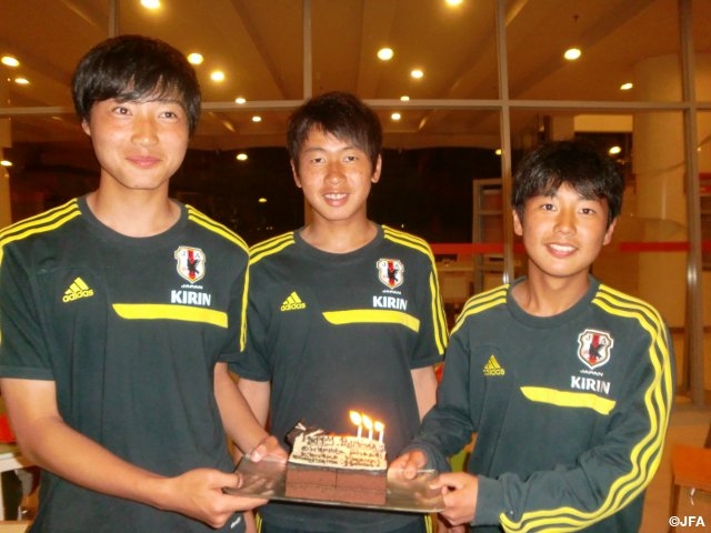 また、本日の夕食では今月誕生日を迎える岡本選手(アルビレックス新潟U-15)、金子選手(大宮アルディージャジュニアユース)、福島選手(松橋中)を皆で祝いました。笑いが起きるにぎやかな夕食の時間で、チームの雰囲気が高まりました。明日はいよいよ「00ジャパン」初の海外での試合となります。