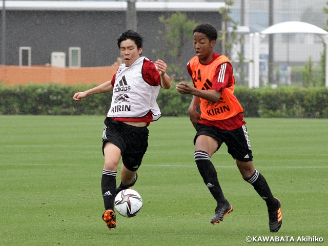 最終日はあいにく雨の天気となりましたが、選手を2チームに分けて紅白戦を行いました。JFA夢フィールドにいる他のカテゴリーの日本代表スタッフや関係者が見守る中、即席チームの紅白戦とはいえ、選手たちは「自分たちの良さを出して、勝負にもこだわろう」と話しながら緊張感を持って試合に臨みました。