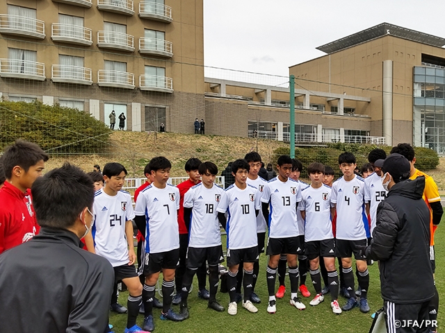 最終日の1日(金)には尚志高校と40分×3本の形式で練習試合を実施しました。尚志高校は新1年生のチームで臨み、早生まれを除くと基本的に新中3の選手が中心のU-15日本代表にとっては1学年上の相手となりました。強風の中行われた試合は、序盤は風下かつ相手の激しいプレスと高いフィジカルを生かしたプレーに押し込まれる時間が続きましたが、トレーニングで培った守備の連係をいかし無失点で耐え抜きます。次第に落ち着きを取り戻し、自分たちがボールを保持する時間が長くなると、得点チャンスを作り始めますが、相手の好守にも阻まれ、1本目は0-0で終了します。
