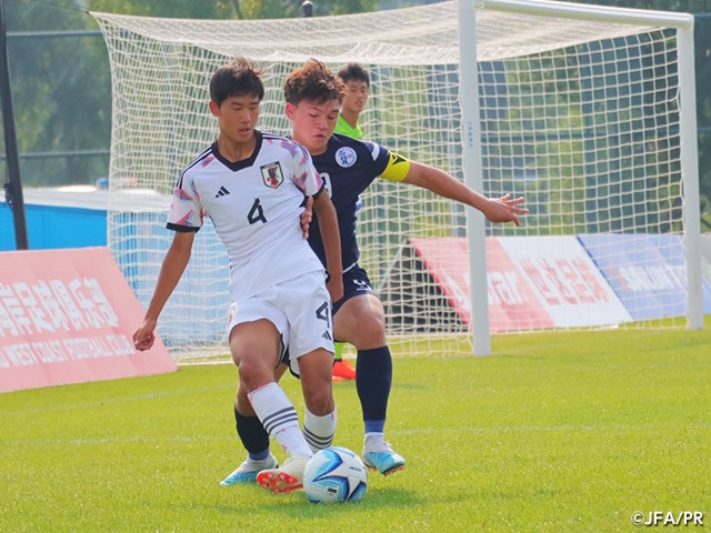初戦となったグアム戦は開始早々の前半2分に渡邉春来(東京ヴェルディジュニアユース)の前線への縦パスを右サイドで上手く受けた原湊士(サンフレッチェ広島F.Cジュニアユース)がドリブルでペナルティエリアへと持ち込み、相手GKのポジショニングをよく見てシュートを放ち、先制点を決めます。この1点を皮切りに3分に小川直澄(浦和レッドダイヤモンズジュニアユース)が、5分には浦川慶がゴールを決め、一気に点差を広げます。その後も相手に付け入る隙を与えずに果敢にゴール前へとボールを運ぶU-15日本代表は立て続けに伏原俐空(神村学園中)がPKを獲得し、追加点をあげます。