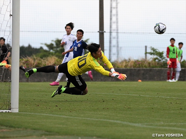 第1試合では東海プリンスリーグに所属する強豪、藤枝明誠高の球際の強さや切り替えの速さに、中盤でボールを奪われ、チャンスを作られます。U-16日本代表もこのトレーニングキャンプ中にも繰り返し伝えられたボールを奪い切る守備をベースに、ゲームキャプテンを務めたFW後藤啓介選手(ジュビロ磐田U-18)が何度かゴール前で決定機を迎えますが得点には至りません。54分には左SB早川隼平選手(浦和レッズユース)のスローインから後藤選手のポストプレーを起点にサイドを突破すると、折り返しにMF宮原勇太選手(興國高)がシュートを放ちます。一度はシュートをブロックされたものの、自ら押し込み先制します。その後70分、中盤で相手に囲まれてボールを奪われるとショートカウンターから失点し、同点とされます。U-16日本代表も77分にカウンターから左サイドでMF鈴木陽人選手(名古屋グランパスU-18)がドリブルでためを作り、ディフェンスラインの裏に浮き球のパスを送ると、FW磯崎麻玖選手(大宮アルディージャU15)が胸トラップから冷静にゴールに流し込み勝ち越し。しかし終了間際のラストプレーで相手にドリブルでペナルティエリアに侵入されると、相手を倒しPKを与えて失点。2-2の同点で藤枝明誠高との試合を終えます。