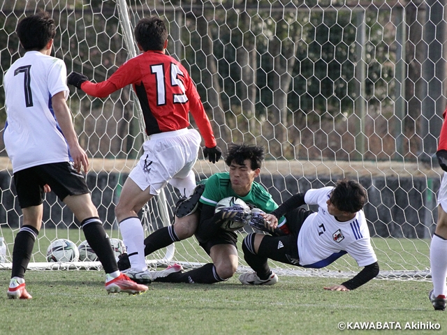3月11日(金)、東山高校との試合は、前半は風下ということもあり、強度の高い東山高校に押し込まれる展開が続きます。ゴール前の体を張った守備でピンチを凌ぐと、前半をスコアレスで終了します。試合が動いたのは後半12分、前日入念にトレーニングを行ったセットプレーから得点が生まれます。左サイドの突破をきっかけに得たコーナーキックから、ファーサイドでフリーになった松本遥翔選手(鹿島アントラーズユース)が頭であわせて先制。その後も勢いに乗って何度も相手ゴールに迫りますが、なかなか追加点を奪うことはできません。逆に試合終盤には圧力を増した東山高校に何度も決定機を作られますが、DFの集中した守備、そしてキャプテンマークを巻いたGKの後藤亘選手(FC東京U-15深川)のセーブでゴールを許さず、1-0で初戦に勝利しました。