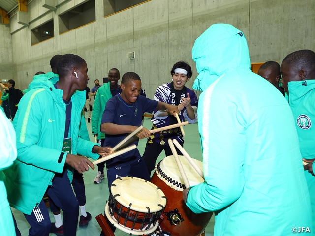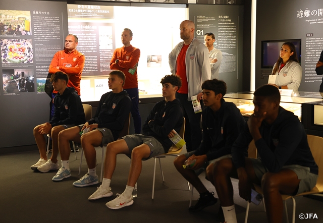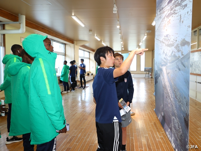 福島県のJヴィレッジで開催中の「U-16インターナショナルドリームカップ2023 JAPAN」に出場しているU-16日本代表、オランダ代表、アメリカ代表、ナイジェリア代表の4チームは、試合の中日となる6月3日(土)、文化交流プログラムとして「震災遺構 請戸小学校」と「東日本大震災・原子力災害 伝承館」の見学と、和太鼓体験を行いました。