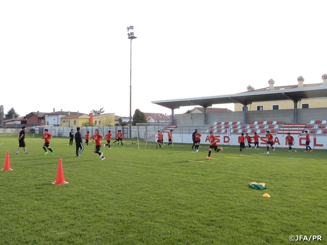 初日は、「緊張もあるかもしれないが、元気よく声を出し合っていきましょう」という楠瀬直木監督の言葉からトレーニングを開始。長旅で疲れた身体をほぐすため、全員でランニング、ストレッチを行い、その後はアジリティトレーニング、パス&コントロール、ポゼッションを行いました。選手たちは精力的に声を出し合い、この日のトレーニングを終えました。24日(火)は午前中トレーニングを行い、午後は大会セレモニーに参加します。