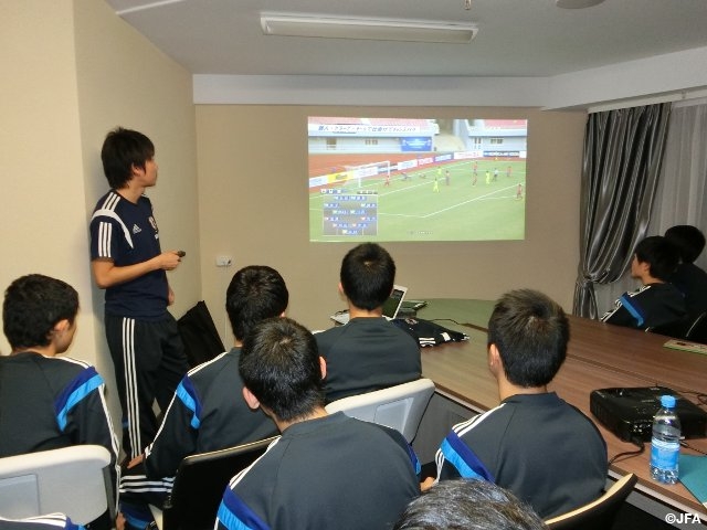 午後からは時間を区切って3回のミーティングを実施。1回目は選手のみで昨日の試合の映像を見てディスカッションを行い、2回目は、昨年行われた「AFC U-19選手権」の振り返りビデオを見て、攻撃のパターンを参考にスピードアップするタイミングなどを片桐テクニカルスタッフより学びました。3回目のミーティングでは、齊藤コーチが「試合の入り方」のレクチャーを行い、自身のワールドカップ出場の経験を若い選手たちに伝えていました。