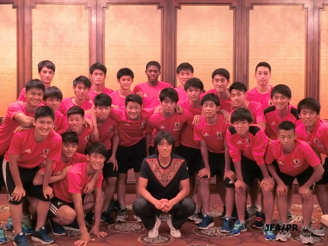 28日(木)の夜には、ジュビロ磐田の中村俊輔選手が宿舎を訪れ、選手たちに自身の体験談を話してくれました。1997年のFIFAワールドユース(現U-20ワールドカップ)に始まり、シドニー五輪やワールドカップ出場を経て体感したこと、サッカーキャリアで印象に残っている言葉について丁寧に語り、選手たちは時折メモを取りながら聞き入りました。