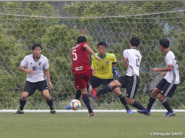 数学年上の選手たちとの対戦、また残り2ヶ月に迫ったFIFA U-17ワールドカップを控えているなか落とせないトレーニングマッチとなり、試合前には森山監督から「攻守にメリハリを持ってコンパクトにプレーする」とゲームのコンセプトが伝えられました。40分×3本の形で実施された1本目は互角にボールを持つ展開が続きますが、相手の圧力になかなか効果的にボールを繋げずチャンスを作れません。すると、10分に中央からボールを持ち込まれると右に流れていた相手FWにダイレクトでゴール右上に蹴り込まれ失点します。その後も合宿の疲れが見える選手たちはゴールを奪えずに1本目を終了します。