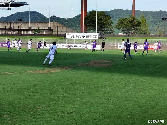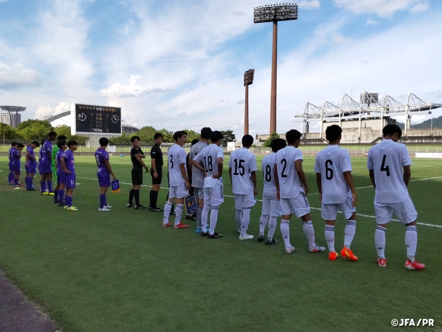 後半はサンフレッチェ広島F.Cユースに攻め込まれる時間帯もあり、GK小林将天選手(FC東京U-18)の好セーブでピンチを凌ぐと、直後にこの日キャプテンマークを巻いたDF畑野優真選手(横浜F・マリノスユース)が奪ったボールを自らドリブルで持ち上がって裏にパスを送ると、交代で入った直後のFW郡司璃来選手(市立船橋高)が抜け出してGKとの1対1を制し追加点を奪います。その後も守備陣が最後まで得点を許さず試合は終了。2-0で初戦を勝利で飾りました。