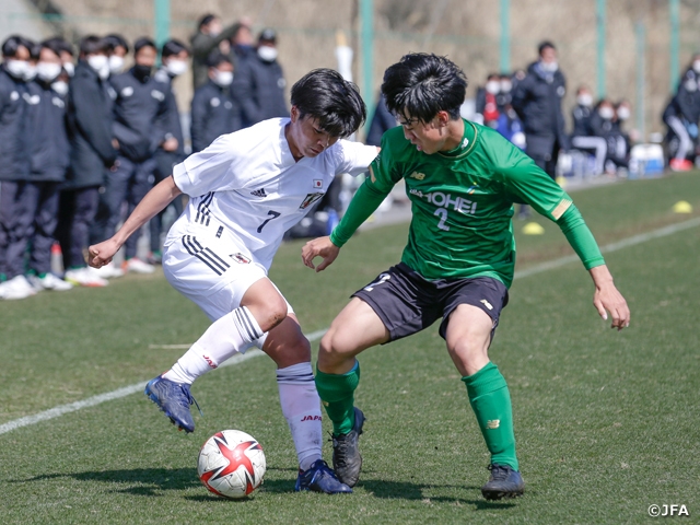 大会最終日となる3月21日(月)は昌平高校との対戦が決まり、大会最後の試合を勝利で締めくくろうと試合に入ります。しかし、立ち上がりから技術の高さを見せる昌平高校を相手に、6分には個人技で最終ラインを突破されるとGKとの1対1を決められ失点。その後も15分にスローインから相手をフリーにしてしまいペナルティエリア内に侵入を許すと、ゴール前で合わせられて0-2に。それでも27分、右サイドからのクロスにファーサイドで合わせたところを最後は幸喜祐心選手(FC琉球U-18)が押し込み1点を返します。U-17日本代表はハーフタイムにフィールドプレイヤーを全員入れ替えて後半の巻き返しを狙います。しかし50分、相手FWに裏に抜け出されて失点、再び2点差に広げられると、最後まで流れを変えることができず、そのまま1-3で試合は終了しました。