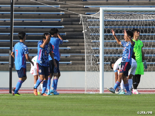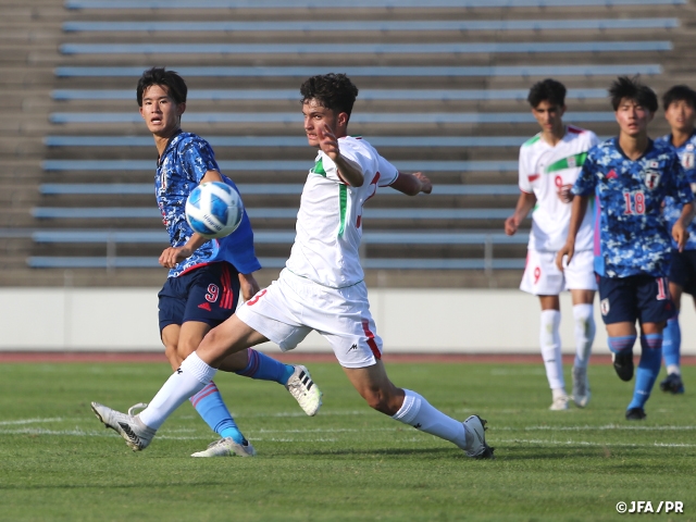 日本はいい形で試合に入りましたが、最初の20分は一進一退の戦いに。その後の30分にFW花城琳斗選手(JFAアカデミー福島U18)がPKで1点目を決め先制。前半を1-0で終えました。暑さが残る後半には選手にも疲れの色が見えてきましたが、それでも積極的にボールを奪いにき、53分に花城選手が2点目を奪いました。86分に失点するも、2-1で試合を終えました。