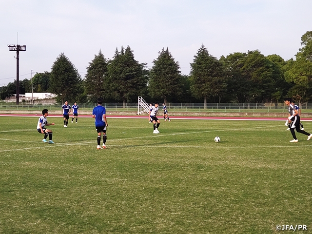 6月8日(木)には鹿島アントラーズユースとトレーニングマッチを実施。大会に向け、鹿島アントラーズユースにも協力いただきながら、15分×5本+20分という変則的なトレーニングマッチを実施しました。様々な状況を想定し、鹿島アントラーズユースにも戦い方を変えてもらいながら、本番に向けて細かな戦術やイメージのすり合わせを行いました。また、前回4月末のトレーニングキャンプに続き、中村憲剛ロールモデルコーチや大黒将志ゲストコーチも参加(成田市の国内事前キャンプのみ参加)し、攻撃の部分を中心に、鹿島アントラーズユースとの試合で出た課題に対して、具体的なフィードバックが行われました。