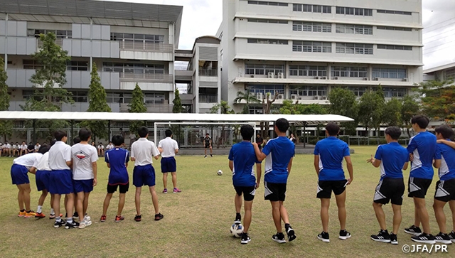 6月13日(火)には、宿泊ホテル敷地内のグラウンドでコンディション調整メインのトレーニングを行い、蒸し暑い環境の中でさっそく汗を流しました。6月14日(水)は、バンコク日本人学校を訪問して、学生との交流プログラムを実施しました。