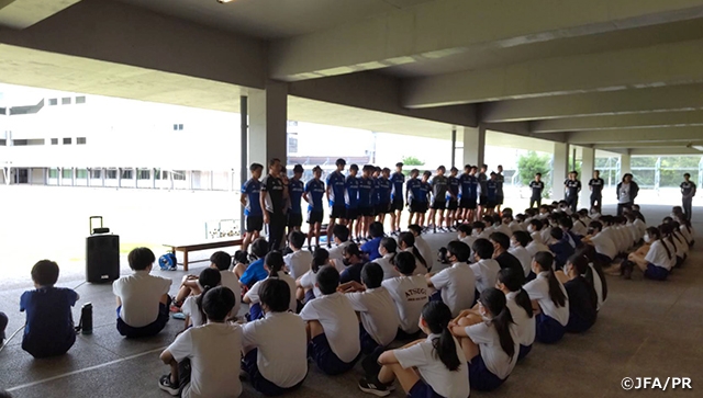 その後、場所を学校のグランウドに移しU-17日本代表vs日本人学校のPK戦を実施し、大いに盛り上がるなど、笑顔の絶えない交流会となりました。選手たちも、生徒たちの歓迎に、たくさんのエネルギーをもらった様子でした。