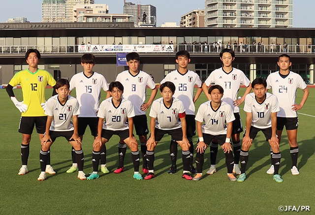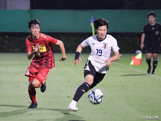 選手を入れ替えて後半が始まると、積極的なプレーが見えはじめ躍動感が生まれます。50分にはDFの本多康太郎選手(湘南ベルマーレU-18)のサイドチェンジを起点に、吉永夢希選手(神村学園高)の縦パスに抜け出した望月耕平選手(横浜F・マリノスユース)が相手のスライディングを受けながらも、粘り強いドリブルで左サイドを突破しマイナスのクロスを入れると、最後はゴール前で山口太陽選手(FC東京U-18)が合わせて1-1の同点とします。その後も逆転を目指し、何度も相手ゴール前に迫るものの、チャンスを決めきることができず試合は終了。多くの課題が見つかる内容となりました。