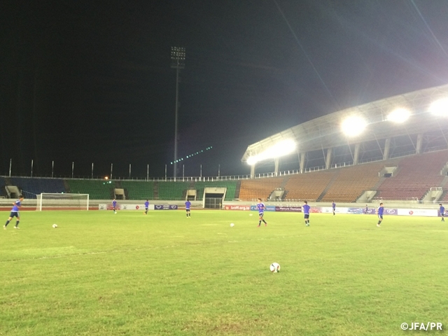 翌日から始まるAFC U-19選手権2016予選に向けて、U-18日本代表は試合会場となるNational Sports Complex Stadiumで公式練習を行いました。練習では選手一人一人がボールを動かしながらピッチコンディションを確認し、シュート練習や11対11のゲームを行って初戦に向けた最後の調整を終えました。
