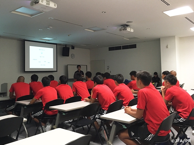 チームは午後1時に宿舎に集合すると、午後4時からのトレーニング前にミーティングを実施。影山監督が「今回の大会は11月にモンゴルで行われるAFC U-19選手権2018予選に向けての強化活動でもあるが、このSBSカップでの結果にもこだわりたい。時間は限られているが、優勝を目指すのでトレーニングから緊張感を持って取り組んでいこう」と選手たちに語りました。