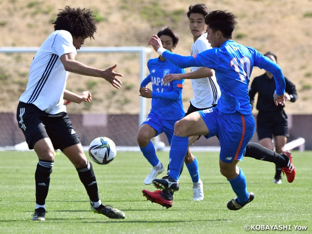 試合は、お互い序盤からインテンシティ高くぶつかりあい、主導権の奪いあいになります。高校選抜が走力を活かし、攻守の切り替えでU-18日本代表を上回り、チャンスをサイドから作り、日本も鋭いカウンターからチャンスを演出するなど、両チームにチャンスは生まれるもののなかなかゴールは生まれません。しかし、34分、高校選抜が左サイドを突破すると、ヘディングシュートのクリアミスを流し込み、日本は先制点を許します。2本目の45分も一進一退の展開が続き、決定機は生まれません。最後の3本目は、92分再びクリアミスより、ゴールを流し込まれ日本は2点目を許します。しかし、116分、日本は中盤でボールを奪い、素早く攻撃に転じ、FW鈴木輪太朗イブラヒーム選手がスペースに走り込んだMF根本鼓太郎選手に送り、シュートを放つと一度はGKに防がれますが、MF松木玖生選手が何とか押し込み1点を返します。その後はお互い体力的にも厳しい時間が続き、高校選抜の体を張った守備に攻めあぐねます。そして、135分には、右サイドを破られると、ニアで上手く合わされ、3失点目を許し、そのまま1-3で敗戦。高校選抜にとっては、最後の活動を有終の美で締めくくり、U-18日本代表にとっては初めての活動で悔しい経験となりました。