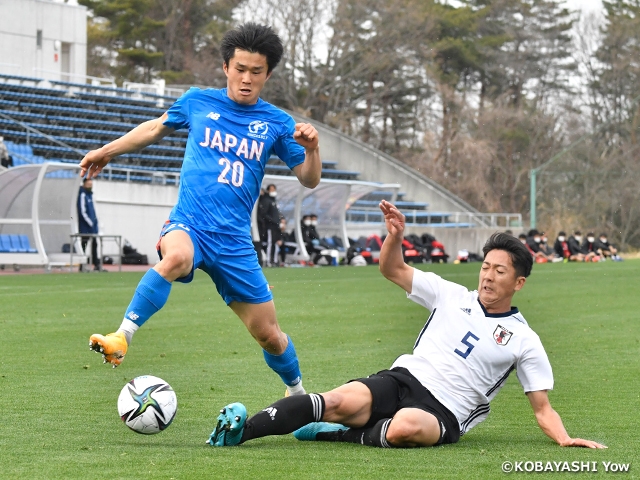 U-18日本代表候補は、トレーニングキャンプ3日目、初の対外試合で日本高校サッカー選抜と対戦しました。試合は45分×3本、施設側の配慮でJヴィレッジスタジアムで実施させてもらいました。昨年、ほぼ対外試合を組むことができずにいたこの年代にとって、貴重な実戦の場となります。対する高校選抜は新型コロナウイルス感染拡大の影響で毎年参加しているデュッセルドルフ国際ユースサッカー大会への参加が叶わず、デンソーカップへの参加など、国内での強化を進め、今回のトレーニングキャンプを集大成の場として、モチベーション高く試合に臨んでくれました。