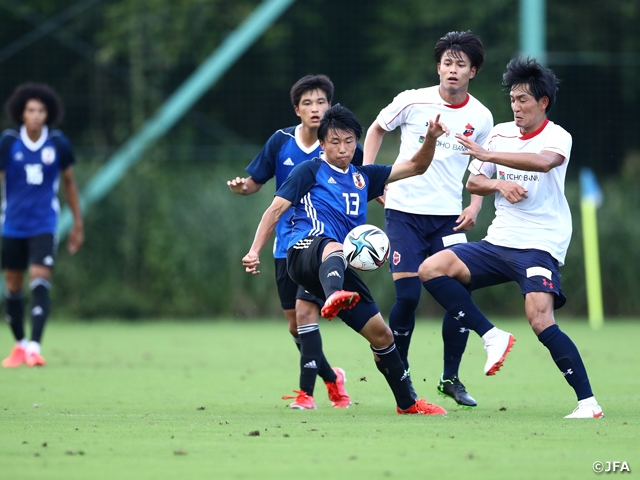 そして26日(木)、今回の活動中で初戦となる、いわきFCとの練習試合を迎えました。フィジカル面で勝る相手に、日本は序盤、少し構えてしまう場面も見られます。それでも、MF甲田英將選手のドリブルから、FW千葉寛汰選手がスルーパスに抜け出してチャンスを作ります。その後は、なかなか前にボールを収められない日本に対して、相手が優位に試合を進め、17分には鋭いスルーパスからGKとの1対1を許しますが、GKバーンズアントン選手が勢いよく前へ飛び出し、辛うじて防ぎます。時間が進むに連れて、相手の迫力に慣れてきた日本はDFラインで安定した守備を固めると、DF菊地脩太選手、DFチェイスアンリ選手中心にリスク管理を徹底させて相手に決定機を与えません。守備から徐々に流れを掴み、相手の圧力にも慣れてくると、日本は両サイドから仕掛けていきます。29分、この試合で何度もドリブル突破を仕掛ける甲田選手が右サイドでボールを受け、スピードに乗って仕掛けると、相手のファウルを誘いPKを獲得。千葉選手が冷静に決めて先制点を奪います。42分には、MF山根陸選手のロングパスを受けた千葉選手が背後への飛び出しから惜しいシュートを放ちますが、僅かに外れ、前半は1-0で終了します。