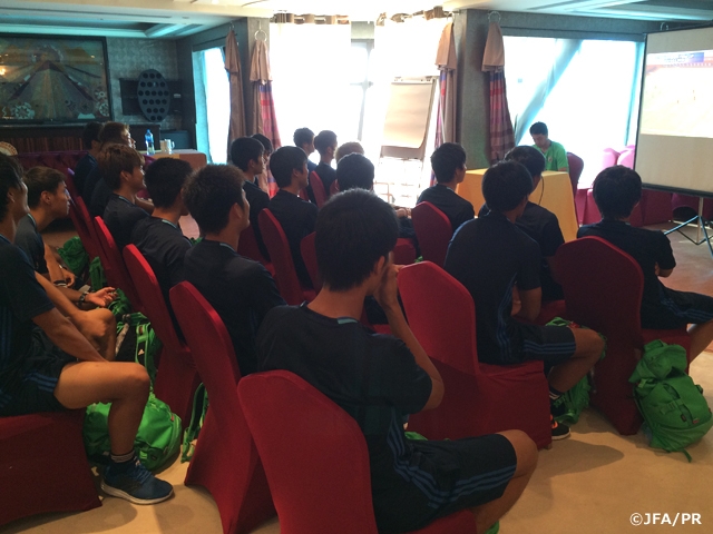 グループステージ第3戦 対 U-19カタール代表戦を明日に控えたこの日は、まずトレーニング出発前にチームミーティングを行いました。20日のカタールとの試合に備え、相手の特徴等を確認すると共に、これまでの自分たちの試合で良い流れから得点したシーンをまとめた映像を観ることで、良いイメージを持ってトレーニングに臨みました。
