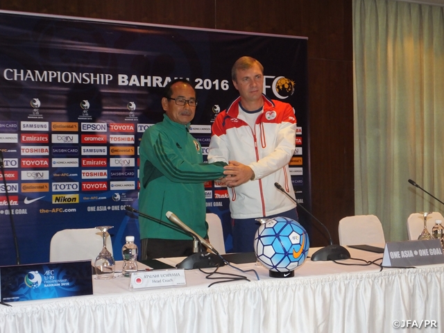 翌22日(土)は、2日後に控えた準々決勝 対 U-19タジキスタン代表との試合に向け、通常通りトレーニングを行いました。午前中には内山篤監督がU-19タジキスタン代表監督とともに記者会見に登壇し、試合に向けての抱負を語りました。