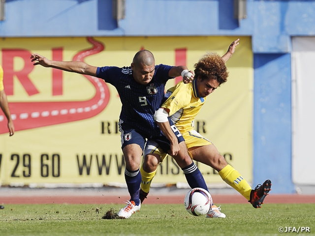 試合前、影山監督から「最初のプレー含め、思いっきりいくこと」と背中を押された日本は立ち上がりから積極的に前線からボールを奪いにいきます。しかし、相手もフィジカルとロングボールを活かし、日本の攻撃を交わしていきます。3分には、日本守備陣がゴール前でもたついている所を奪われ、GKとの1対1を迎えますが、GK中野小次郎選手が防ぎます。その後は、日本も落ち着きを取り戻し、お互い初戦を飾りたい為、激しい球際での競り合いが続きます。30分には、中央でボールを上手く受けたFW飯島陸選手がドリブルで相手守備陣を抜き去りシュートを放ちますが、相手GKの正面。徐々に流れを掴んでいくと、44分MF上月壮一郎選手との連携で、DF東俊希選手が左サイドを駆け上がり鋭いクロスを上げると、飯島選手がタイミング良くヘディングで合わせ先制点を奪います。立て続けにアディショナルタイム3分にも、FW加藤拓己選手がヘディングで後ろに流したボールに飯島選手が反応し、決定機を迎えますが、シュートは相手GKに防がれ追加点を奪えず前半は1-0で終了します。