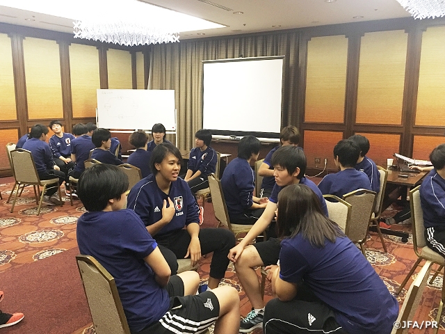 夕食後のミーティングでは、ポジション別に分かれ、この日の試合で自分たちができたこと、できなかったことをグループごとに洗い出し、ディスカッションをしました。