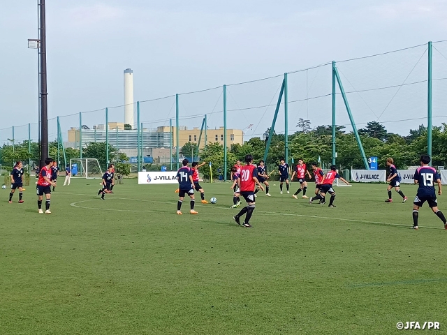 18日午前は、5月に参加したSUD Ladies Cup 2023の振り返りを映像を交えながら行い、チームとして向かうべきイメージの共有をしました。午後にはトレーニング後、U20東日本学連選抜とトレーニングマッチ(20分×1本、15分×1本)を行いました。1本目は19分、土方麻椰選手(日テレ・東京ヴェルディベレーザ)からの鋭い左クロスを笹井一愛選手(ノジマステラ神奈川相模原)が頭で合わせ先制点を奪います。2本目では開始早々2分に小川由姫選手(ジェフユナイテッド市原・千葉レディース)が追加点を奪うと、9分に小山史乃観選手(セレッソ大阪ヤンマーレディース)が得点を重ねます。交代後や試合が終わってからも選手同士で話し合う様子が見られ、実りあるトレーニングマッチとなりました。