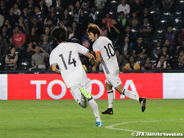 しかし日本もすぐに声を掛け合って反撃を開始します。53分には右サイドの岩田智輝選手が前線へ狙って斜めに入れたグラウンダーのパスに対し、相手DFが触ったセカンドボールを神谷選手が前向きに拾って、その流れのままにミドルシュート。コースへ飛んだ好シュートがゴールネットを揺らし、早々に追い付いてみせました。その後も日本は前半に出た課題をよく修正しながら、タイに対して優勢に試合を進めます。