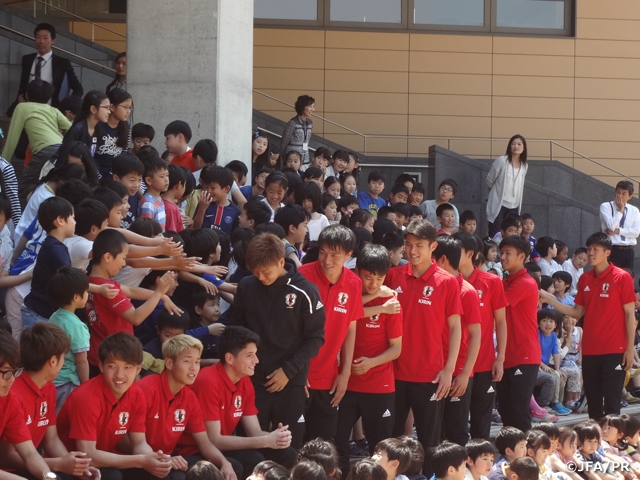 この日、チームはSuwon入りする前にソウル日本人学校を訪問しました。400人を超える幼稚園児・小中学生に大きな声で出迎えられた選手たちは一人ひとり自己紹介をし、まずはFW久保建英選手がリフティングを披露。その後のPK対決でもGK波多野豪選手、FW小川航基選手らが場を盛り上げて子どもたちから歓声を浴びます。最後は中学生とミニゲームで対決し、交流会を締めくくりました。