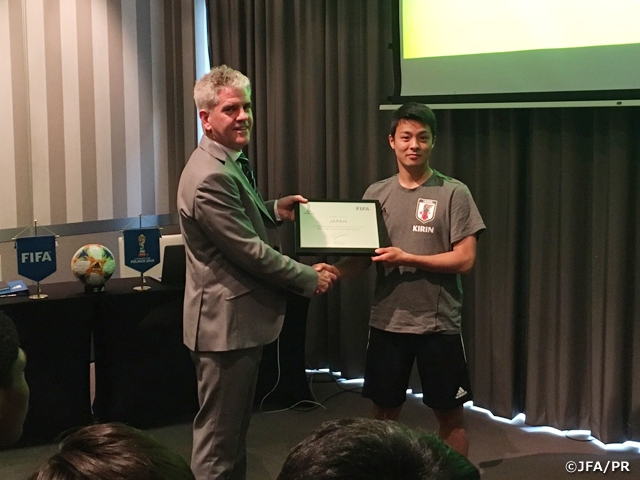 翌20日(月)は朝から国際サッカー連盟(FIFA)のスタッフ達による歓迎の挨拶の他、競技規則改定についての説明、アンチ・ドーピングやインテグリティ(八百長撲滅)等に関するブリーフィングが行われました。会の冒頭には初戦会場となるビドゴシュチュ・スタジアムのFIFAジェネラルコーディネーター(運営責任者)であるクリス・ケンプ氏からU-20日本代表チームを代表してキャプテンの齊藤未月選手へ記念品の贈呈も行われました。FIFAからの様々な説明に対し選手たちは集中した眼差しで聞き入り、「いよいよ本番」という表情を見せます。