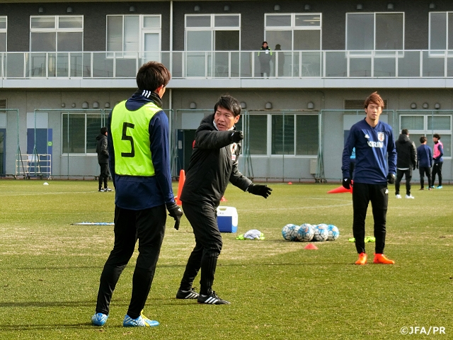 新しいチームが立ち上がってからは、12月のタイ遠征に続いて2回目の活動となりますが、前回から引き続き選ばれている選手は6選手のみ。「チームのベースをしっかり積み上げて、前進させていきたい」と語る森保一監督は、コンセプトを浸透させるべく、「ボールを動かすなかで頭を使おう」「常に準備を」「ボールを受けたあとの次の動きを考えて」とプレーを止めながら情熱的に声をかけていきます。またサポートする横内昭展コーチ、和田一郎コーチも、要所要所で選手にアドバイスを送ります。