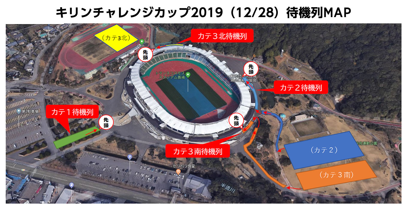 - カテゴリー1メインスタンド側のチケットをお持ちの方はメインゲートの指席専用待機列へお並び下さい。