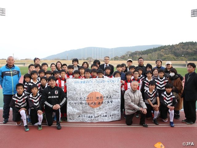 男子日本代表としては28年ぶりの代表戦開催となるここ長崎は、森保監督が高校時代までを過ごした場所です。「たくさんの方に支えていただいて、成長してきた街。サッカーをもって、勝利をもって、恩返しにつながるような試合を」と話していました。練習前には、出身校である土井首小、土井首中、南陽小のサッカーチームの子どもたちが寄せ書きとともに激励に訪れ、束の間の交流を楽しんでいました。