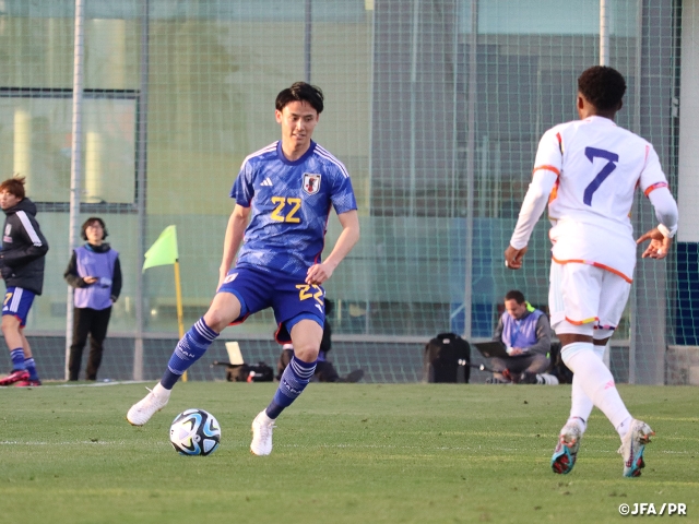 今年初の試合となった24日(金)のドイツ戦を2-2で終えた日本はメンバーを7名変更し、ベルギー戦に臨みました。GKには小久保玲央ブライアン選手(SLベンフィカ/ポルトガル)、最終ラインは左から加藤聖選手(V・ファーレン長崎)、鈴木海音選手(ジュビロ磐田)、西尾隆矢選手(セレッソ大阪)、初招集の中村拓海選手(横浜FC)を配し、中盤はアンカーに川﨑颯太選手(京都サンガF.C.)、インサイドハーフに鈴木唯人選手(RCストラスブール/フランス)と藤田譲瑠チマ選手(横浜F・マリノス)を起用。前線は左から平岡大陽選手(湘南ベルマーレ)、木村勇大選手(京都サンガF.C.)、松村優太選手(鹿島アントラーズ)が入りました。