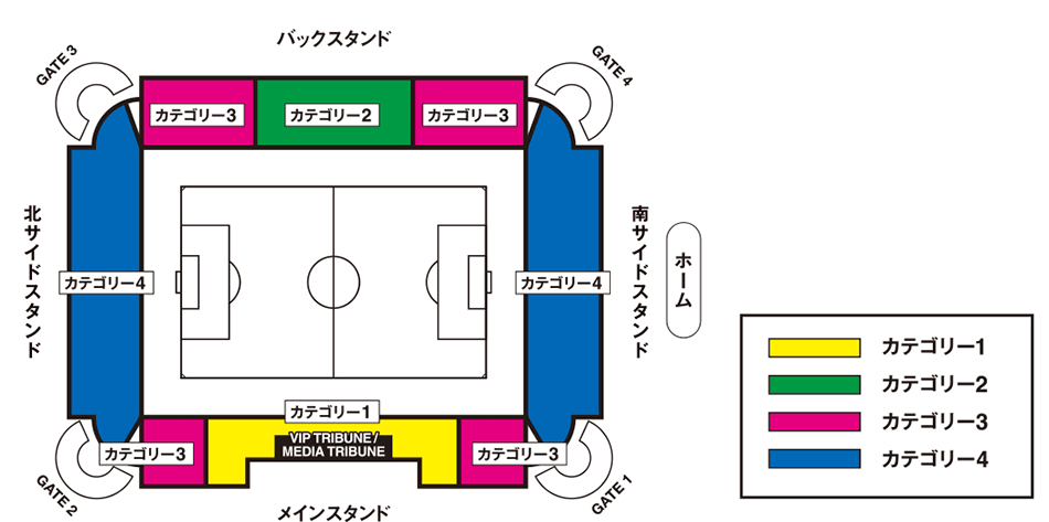 - ゴール裏(カテゴリー4)のエリアには、大旗の使用を含め立ち上がって熱く応援するサポーターが多くいらっしゃる場合があります。また、このエリアは立見エリアのため、各エリア内での移動は可能ですが、混雑時等は移動が難しい場合もあります。ピッチ全体を見渡して、着席しての観戦を希望されるお客様は、指定席での観戦をお勧めします。
