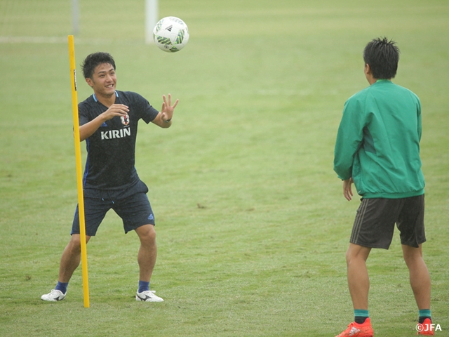 地元クラブC.Sセルジッペとの練習試合から一夜明けて、選手たちは朝から降り続く小雨の中でランニングやストレッチなど、リカバリー中心の練習を実施。GK陣も加わって2組に分かれて行ったボール回しは、レクリエーション的な要素を取り入れ、リラックスした雰囲気のものになり、時折、選手たちから笑い声や歓声が沸き起こっていました。