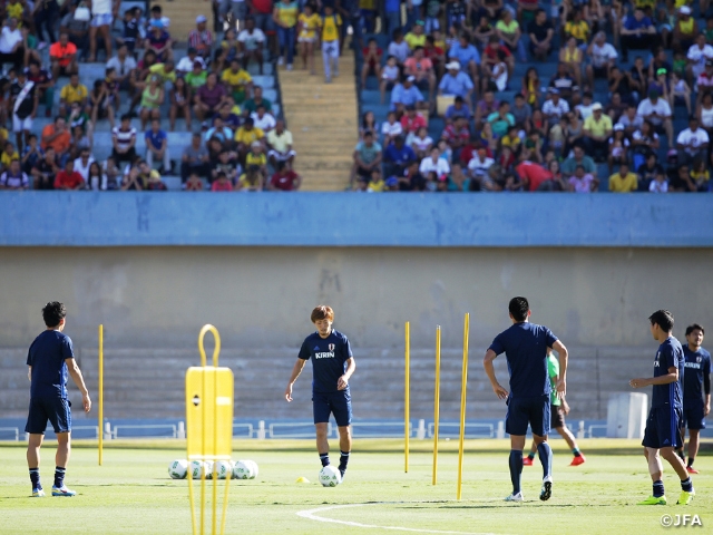 チームはこの日、試合会場のEstádio Estadual Lourival Baptistaで公式練習に臨み、芝生の感触を確かめながら約1時間、湿度は低いながらも快晴の強い陽射しの下で汗を流しました。MF大島僚太選手(川崎フロンターレ)は引き続き別メニューでの調整でしたが、体調不良で前日の練習を回避したDF岩波拓也選手(ヴィッセル神戸)は全体練習に復帰しています。