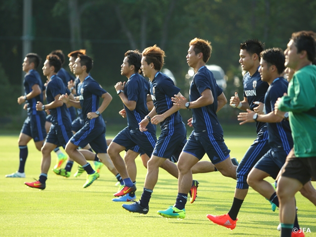 遅れて合流する予定のFW久保裕也選手(BSCヤングボーイズ)らと、体調が優れないMF井手口陽介選手(ガンバ大阪)を除いた13人が参加。約1時間半の練習では、ランニングやフィジカルトレーニングの後に、狭いエリアでの切り替えを意識したパスワークを確認。ハーフコートを使ってワンタッチパスでシュートに持ち込む攻撃練習では、DF塩谷司(サンフレッチェ広島)らがゴールを決めていました。