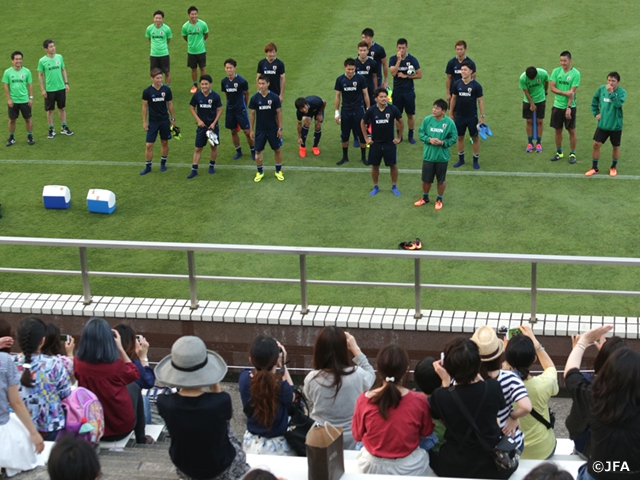 手倉森誠監督は練習を終えると、見学に訪れていたスタンドのファンへ向かってピッチから語りかけ、「マナウスへ行く人はいますか?チームは明日、ブラジルへ発ちます。地球の裏側で魂を持って戦ってきますので、応援よろしくお願いします」と挨拶。スタンドからの暖かい拍手を受けて、練習会場を後にしました。