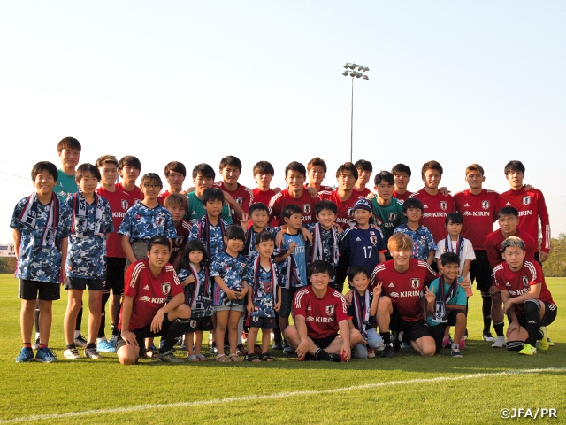 午後のトレーニング前には、バンコク日本人学校に通う子どもたちや在タイ日本国大使館の梨田和也大使が激励に訪れてくれました。タッチ数を制限しながらの11対11でのゲーム形式などで連携を確認したチーム。子どもたちは「がんばれー!」「れおー!」と声援を送り、決まっていくゴールに大喜びしながら見学していました。