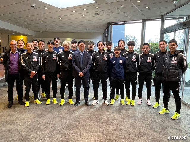 1月28日に日本を出発したFリーグでプレーする9名の選手とスタッフは翌29日の午前中にフランスに到着し、昼食前に同国内での試合の視察に来ていたSAMURAI BLUE森保一監督がチームホテルに訪れ、初めて国際親善試合に臨む若いフットサルの代表選手たちへ激励のメッセージを送ってもらいました。その後、夕方にスペインでプレーする5選手がチームに合流しました。トレーニング前のミーティングでは木暮監督から活動の目的とスケジュールが伝えられ、この後2023年に控えるフットサル日本代表の活動に招集されるよう今回のフランス代表との親善試合でしっかりとアピールして欲しいと伝えられました。初日のトレーニングは陽がすっかり落ちて外気温が0℃を下回る18時から2時間実施しました。入念なウォーミングアップをしてからボールを使って、パスの受け手と出し手の動きやタイミングの確認をし、ミーティングで説明されたチーム戦術を実践するメニューに取り組みました。