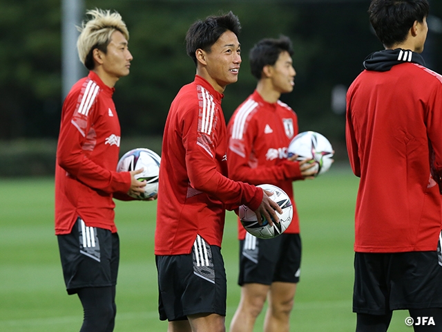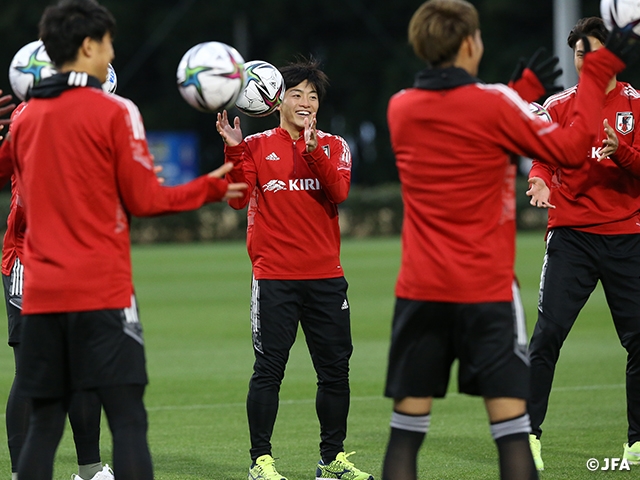 この日はオランダからDF板倉滉選手(FCフローニンゲン)が合流しましたが、感染対策のために、国内組と海外組のエリアも宿泊フロアから移動バス、練習場のロッカー、食事場所まですべてを分けています。一緒になるのはピッチ上だけ。より一層コミュニケーションの質が大事になるだけに、MF田中碧選手も「できるだけ話すように心がけている」と話していました。
