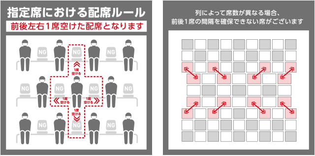 - 前後左右1席空けでの配席となります。2枚の場合も連番でのご用意はできかねます。