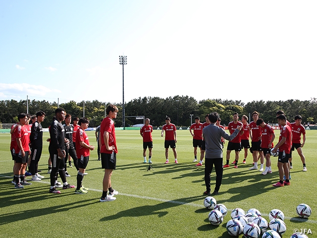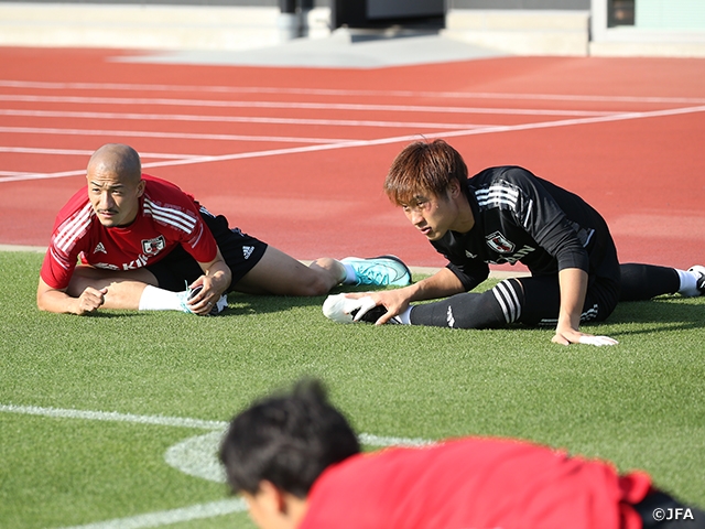 全員の陰性を確認した上で、選手たちは午後から高円宮記念JFA夢フィールドにて初日のトレーニングを実施しました。直前までリーグ戦を行っていたJリーグ組の選手たちは軽めの調整を行ったほか、心身のコンディションを整えることに重きを置いたメニューを消化。2日目からの本格的なトレーニングに向けての準備をこなしました。