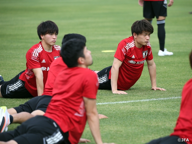 この日は、前日のガーナ戦に長く出場したメンバーはストレッチなどでリカバリーに務め、それ以外の選手たちはパス&コントロールやシュート練習を行いました。DF菅原由勢選手らが積極的に盛り上げ、約1時間強、汗を流しました。